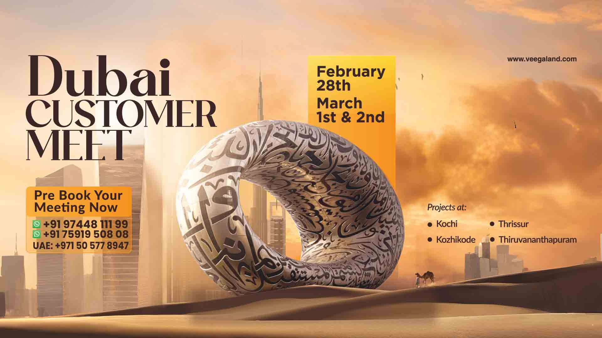 Experience biophilic urban living built on trust, quality, and timely delivery. Veegaland Homes is coming to Dubai for an exclusive customer meet on February 28, March 1 & 2. Visit us to explore our projects in Keralaβs prime locations and take the next step toward owning your dream home. Meet our team and unlock exciting offers on bookings! Pre-book your meeting: +91 97448 11199 | +91 75919 50808